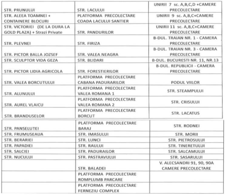 Având în vedere abandonul ilegal de către SC DRUSAL SA al serviciului de salubrizare – componenta colectare, pe raza municipiului Baia Mare, Autoritatea Locală a luat măsuri în regim de urgență și a preluat această activitate. În acest sens, activitatea de colectare zilnică a deșeurilor menajere de la locuințele individuale (case) se va desfășura, din 5 ianuarie, după următorul program:
